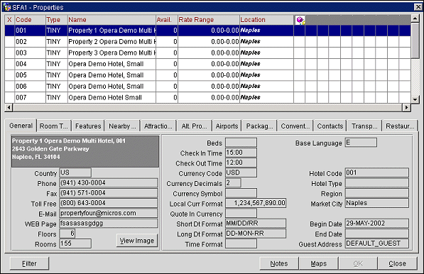 The Properties screen contains detailed information about each property and can be used as an online hotel directory. Besides the information provided in the grid in the upper portion of the screen, you can click on any property to display more complete information in the tabbed area in the lower part of the screen. (See Properties Screen for details.)