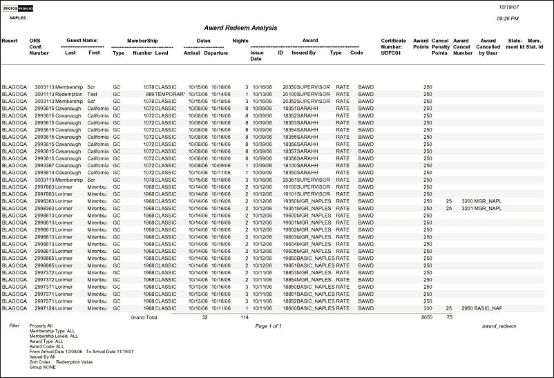The Award Redeem Analysis report provides membership award redemption information so you can assess your current membership award programs and plan for future ones. This report provides multiple filters with results including the ORS Confirmation number, guest name, name of person who issued the award, award and cancellation points, and other membership information. The Award Redeem Analysis report is available for the OPERA Customer Information System (OCIS) membership module.
