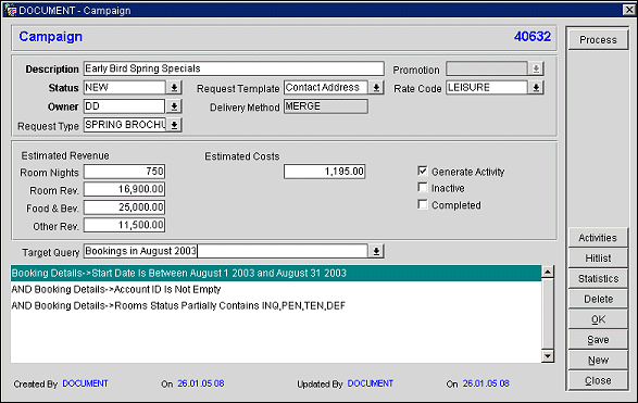 Generate Activity. Select this check box to generate activities associated with the campaign. Following processing, select the Hitlist button to see these activities. The label to this check box changes. (In ORS, only the Generate Profile Request is functional as it pertains to guest profiles. The Generate Activity option is not functional in ORS, and will only display when a new screen is displayed. Once the Target Query is selected the label will change to Generate Profile Request.)