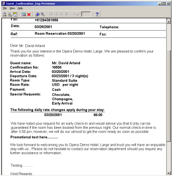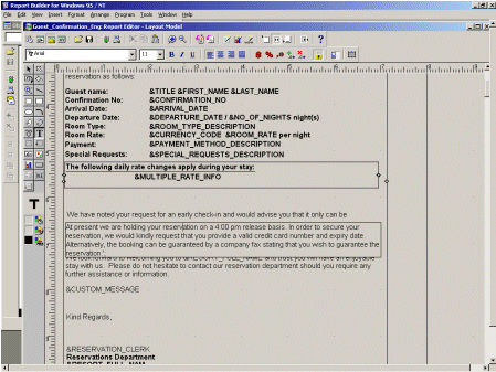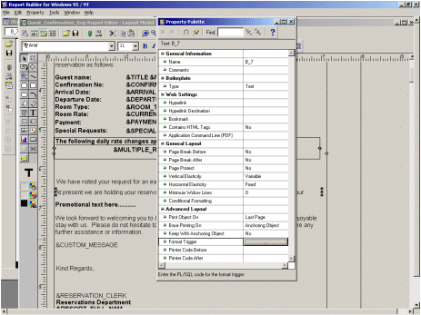 For customizable reports such as confirmation letters and guest folios, it is often necessary to include text or field items only under specific conditions. Running the Oracle Report Builder application from System Configuration>General>Report Setup, selecting your report, selecting Edit and Layout, offers the ability to use conditional formatting for an item using PL/SQL code.