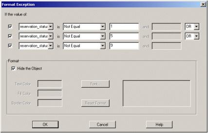 The Conditional Formatting property will allow you to define the formatting for this object based on specific conditions. One of these formatting options is to hide the object completely. Select the … button to activate the Condition Wizard. The Wizard replaces the need to write PL/SQL code to define conditional format triggers.