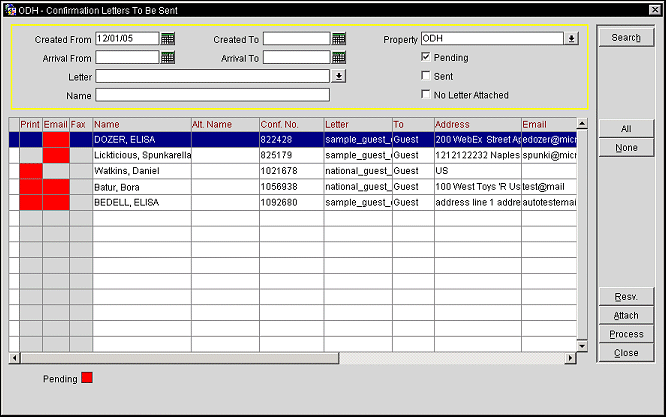Print/Email/Fax. Select the method to be used to send the confirmation letter by clicking an X in the appropriate column. The box is displayed in red when the confirmation has a status of Pending for the type of communication method.