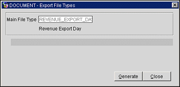 Exports can be manually generated from the Export Files screen (Miscellaneous>File Export or Configuration>External>Export Files). Highlight your choice of export and select the Generate button from the Export File List screen to display the Export File Types screen.