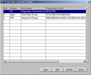 From the Transaction Groups screen you can create New, Edit, or Delete transaction groups. Select an existing membership transaction group and select Edit or New to create a new entry.