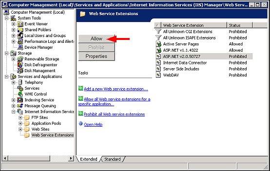 - Verify that the Web Service extension status is Allowed (and not Prohibited). If the status is Prohibited, place your cursor on the ASP .NET v2.0.xxx Web Service extension and select the Allow button.