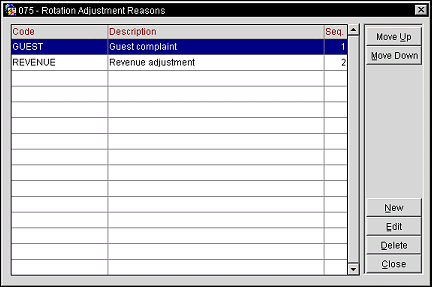 New. Select to display the Rotation Adjustment Reasons screen and create a new rotation adjustment reasons code.