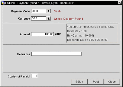 Note: The ESign button is not available when the Payment screen is accessed from Accounts Receivables, Cross Property postings, or the Post It screen.