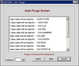 The purpose of the Auto Purge Screen is a quick reference of configured interfaces and the amount of days that the messages in the OXI_HUB message status tables will be kept before being purged permanently. The activation of the purge data is only required once and should be set to Start on the day your central system goes live.