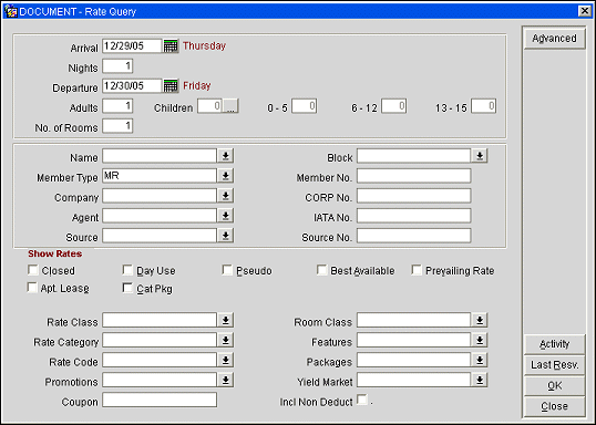 This option lets you see at a glance which rates are available for each room type on any given arrival date, departure date and number of persons. The rate query is like a mini-reservation. You enter the arrival date, number of nights, departure date, number of adults (per room) and number of rooms. The defaults are Arrival date of today (except if the RESERVATIONS > DEFAULT BLANK ARRIVAL DATE application parameter is set to N), one Night, one Adult and one No.of Rooms. You can also optionally enter a rate code, a block code, a source name, company and agent.