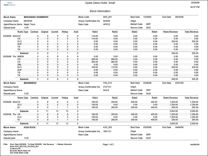 Blocks. Multi Select LOV to select specific blocks to filter by and display in the results of the report. When the application function Blocks > Master Sub Allocations is active, the Master and Sub-Allocations will be indicated in the Block Header Information. Additionally, the Current column will display the available inventory for the Master Allocation and Pickup column will always display 0 rooms.