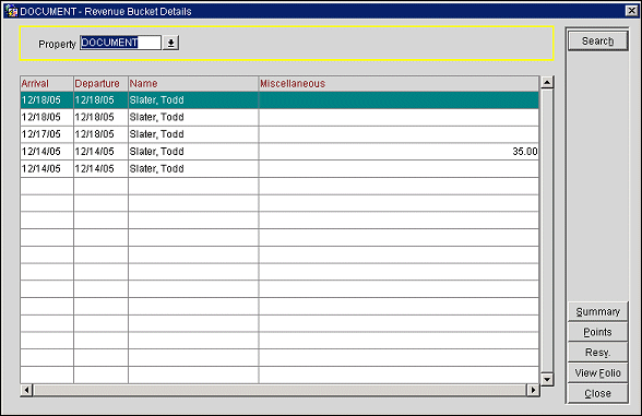 The Revenue Bucket Details screen lists the dates of past stays along with the name of the guest and the amounts of revenue generated. Select the Resv button to display a view-only Reservation screen for the stay highlighted in the Revenue Bucket Details screen grid. Select the View Folio button to display the Folio History screen for the highlighted stay. Revenue is categorized into any number of revenue buckets that have been configured for the Profile revenue bucket type.