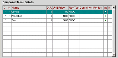 Once selected, these Menu Items will display in the Composed Menu Details grid. They will all have Course = 1 and Order = 1.