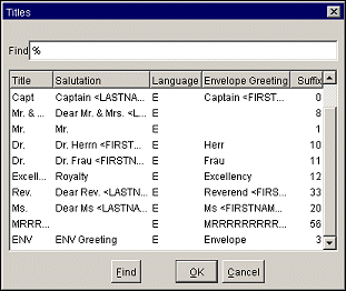In the Title Suffix field, enter a suffix number that identifies the unique combination of Title Code, Description, and Language. Users cannot insert the same Title Code more than once without a Title Suffix. You can create as many descriptions and envelope greetings as necessary for the same Title Code and Language Code. Using German as an example, the user can create several Title Codes=Herr and Language Code=DE that can have envelope greetings. Each combination of Title Code and Description must have a unique Title Suffix number that identifies it, however. For example: